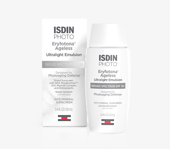 Eryfotona Ageless is an ultralight tinted, fast-absorbing emulsion which helps fight the signs of photoaging. Its innovative formula protects, helps repair and corrects. It combines 100% mineral SPF 50 sunscreen with an innovative blend of peptides, antioxidants, and DNA Repairsomes®, helping repair existing sun damage and reduce the appearance of fine lines and wrinkles.